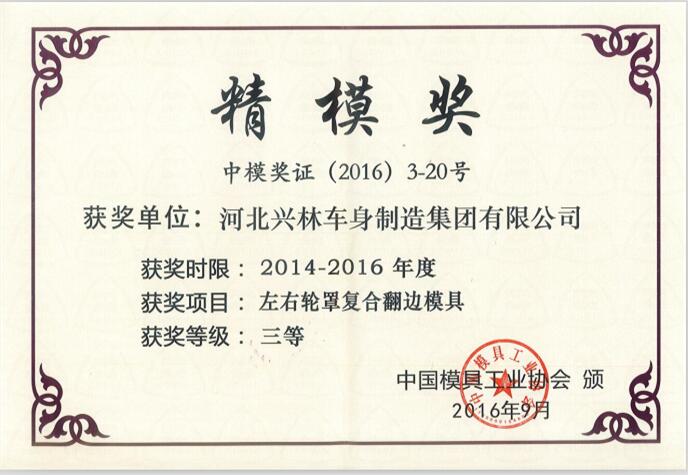 我公司于2016年6月28日至7月1日參加在上海新國際博覽中心舉行的第十六屆中國國際模具技術(shù)和設(shè)備展覽會,展會期間,中國模具工業(yè)協(xié)會繼續(xù)開展了兩年一度的“精模獎”評選活動,我公司憑借“左右輪罩復(fù)合翻遍模具”榮獲2014年~2016年度“精模獎”三等獎。